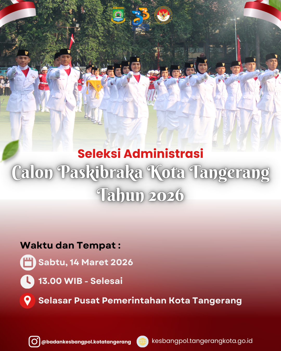 | Description Agenda | Salam Pancasila! Halo adik-adik Calon Paskibraka Kota Tangerang Tahun 2026. Diberitahukan bahwa akan diadakan Seleksi Administrasi secara offline yang akan diselenggarakan pada: Hari/Tanggal : Sabtu, 14 Maret 2026 Waktu: 13.00 WIB - Selesai Lokasi : Selasar Pusat Pemerintahan Kota Tangerang |